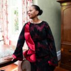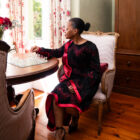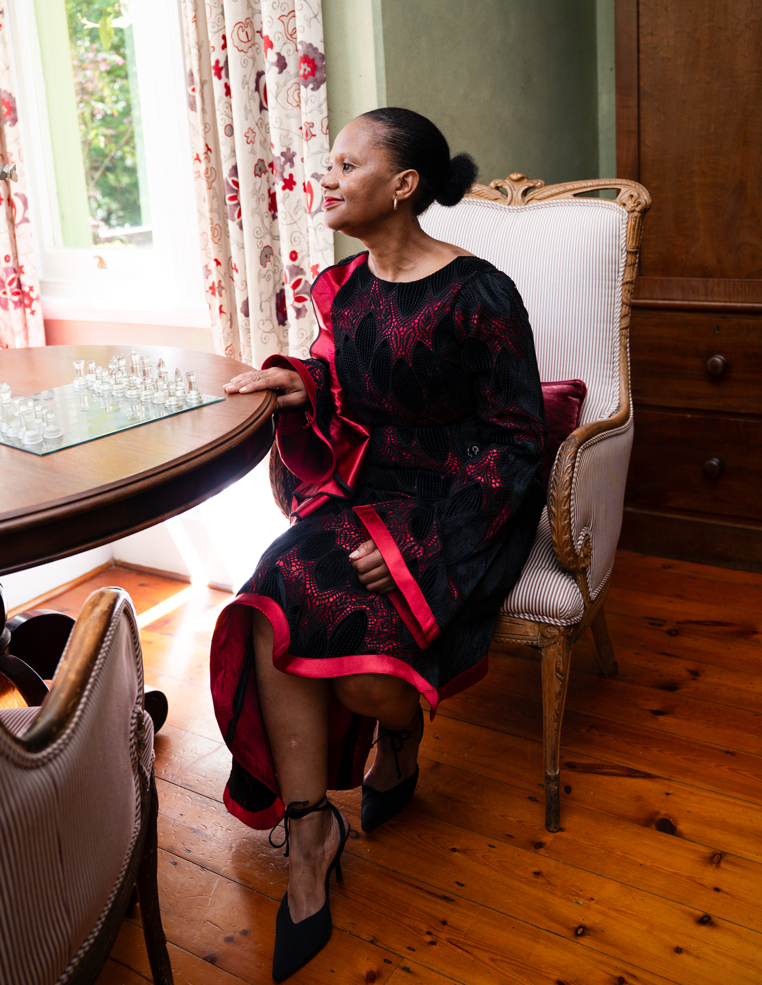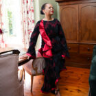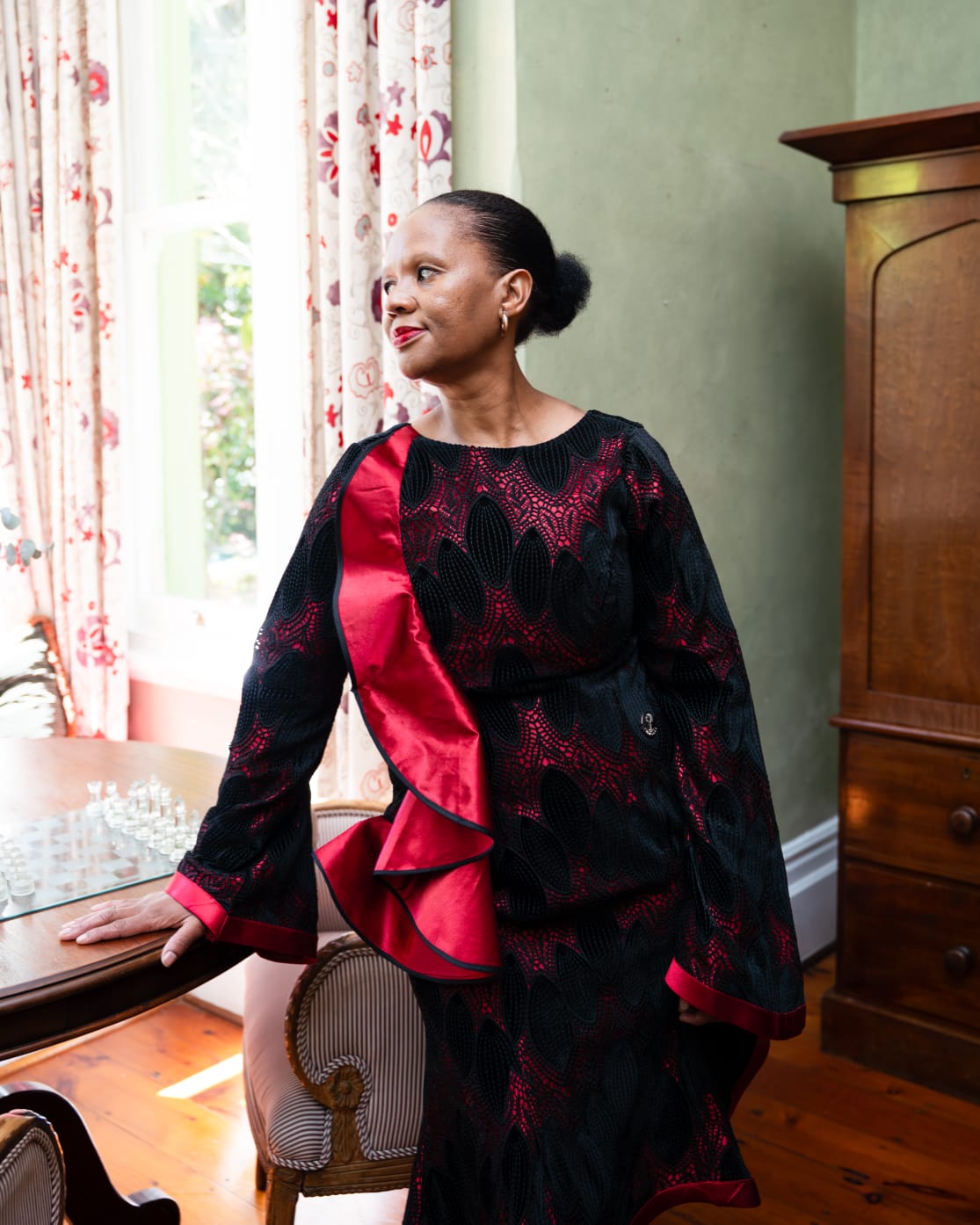 The dress reads as refined and authoritative, with velvet depth and sculptural satin accents providing both richness and visual impact.